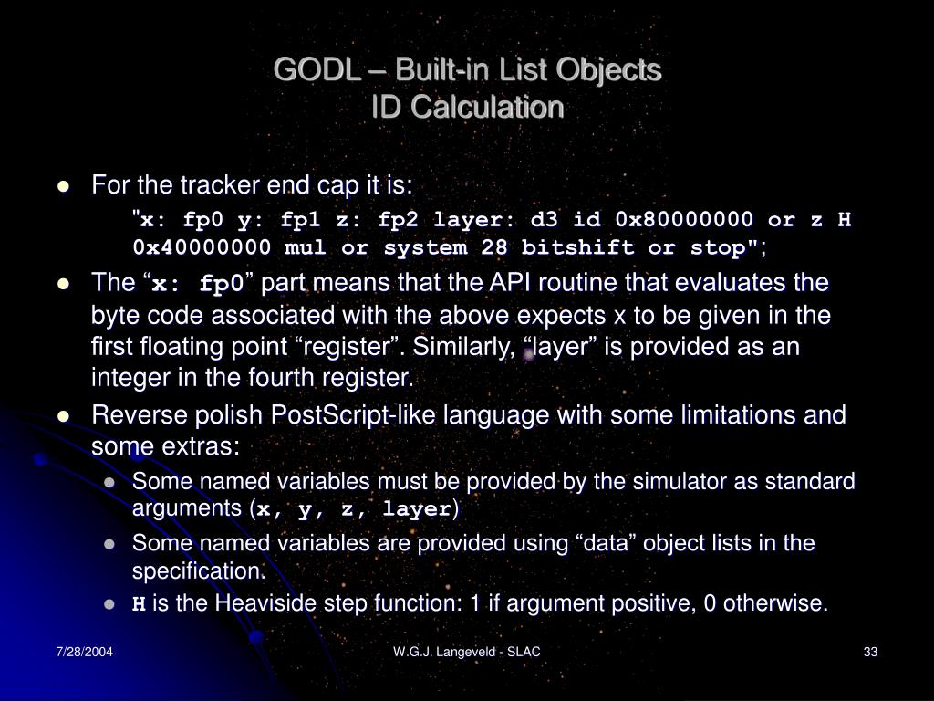 GODL – Built-in List ObjectsID Calculation • For the tracker end cap it is: "x: fp0 y: fp1 z: fp2 layer: d3 id 0x80000000 or z H 0x40000000 mul or system 28 bitshift or stop"; • The “x: fp0” part means that the API routine that evaluates the byte code associated with the above expects x to be given in the first floating point “register”. Similarly, “layer” is provided as an integer in the fourth register. • Reverse polish PostScript-like language with some limitations and some extras: • Some named variables must be provided by the simulator as standard arguments (x, y, z, layer) • Some named variables are provided using “data” object lists in the specification. • H is the Heaviside step function: 1 if argument positive, 0 otherwise. W.G.J. Langeveld - SLAC