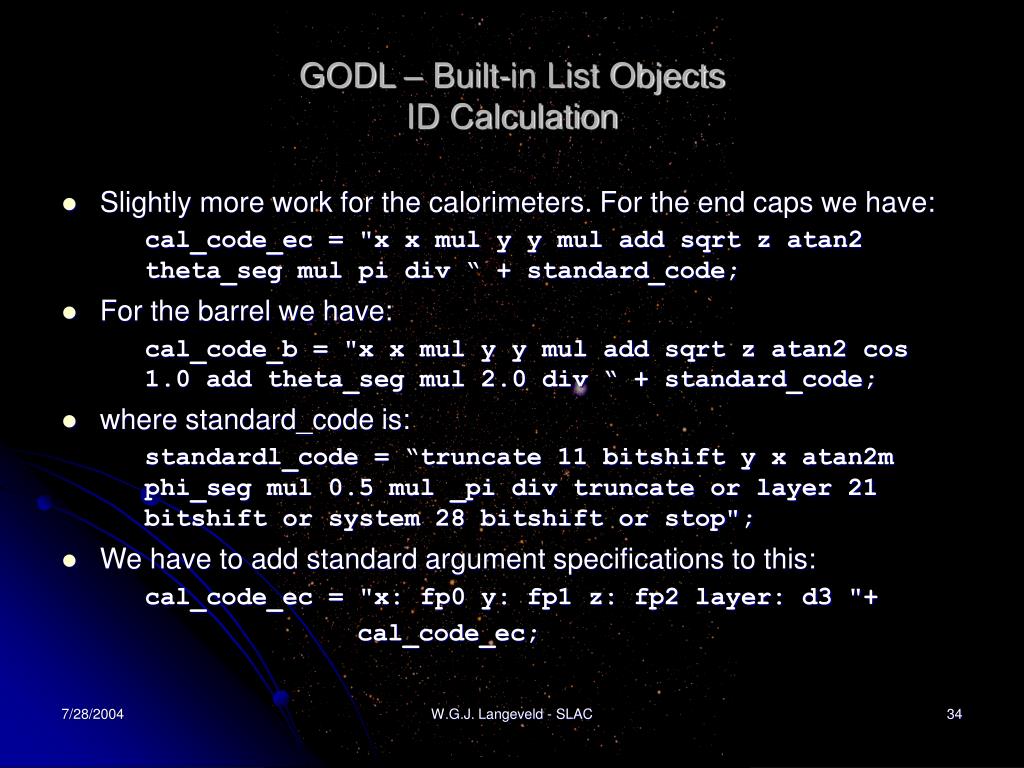 GODL – Built-in List ObjectsID Calculation • Slightly more work for the calorimeters. For the end caps we have: cal_code_ec = "x x mul y y mul add sqrt z atan2 theta_seg mul pi div “ + standard_code; • For the barrel we have: cal_code_b = "x x mul y y mul add sqrt z atan2 cos 1.0 add theta_seg mul 2.0 div “ + standard_code; • where standard_code is: standardl_code = “truncate 11 bitshift y x atan2m phi_seg mul 0.5 mul _pi div truncate or layer 21 bitshift or system 28 bitshift or stop"; • We have to add standard argument specifications to this: cal_code_ec = "x: fp0 y: fp1 z: fp2 layer: d3 "+ cal_code_ec; W.G.J. Langeveld - SLAC
