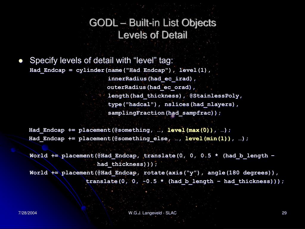 GODL – Built-in List ObjectsLevels of Detail • Specify levels of detail with “level” tag: Had_Endcap = cylinder(name("Had Endcap"), level(1), innerRadius(had_ec_irad), outerRadius(had_ec_orad), length(had_thickness), @StainlessPoly, type("hadcal"), nslices(had_nlayers), samplingFraction(had_sampfrac)); Had_Endcap += placement(@something, …, level(max(0)), …); Had_Endcap += placement(@something_else, …, level(min(1)), …); World += placement(@Had_Endcap, translate(0, 0, 0.5 * (had_b_length – had_thickness))); World += placement(@Had_Endcap, rotate(axis(“y”), angle(180 degrees)), translate(0, 0, -0.5 * (had_b_length – had_thickness))); W.G.J. Langeveld - SLAC