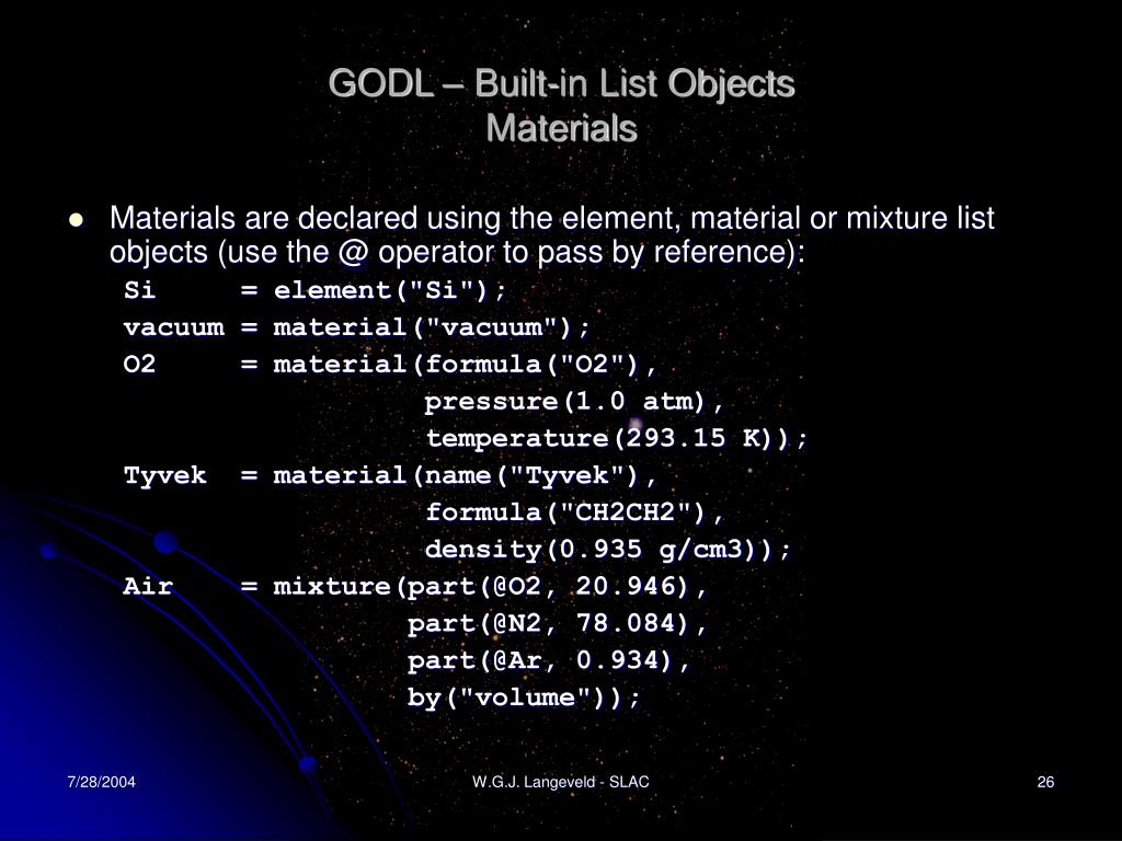 GODL – Built-in List ObjectsMaterials • Materials are declared using the element, material or mixture list objects (use the @ operator to pass by reference): Si = element("Si"); vacuum = material("vacuum"); O2 = material(formula("O2"), pressure(1.0 atm), temperature(293.15 K)); Tyvek = material(name("Tyvek"), formula("CH2CH2"), density(0.935 g/cm3)); Air = mixture(part(@O2, 20.946), part(@N2, 78.084), part(@Ar, 0.934), by("volume")); W.G.J. Langeveld - SLAC