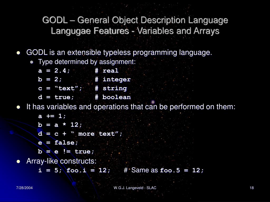 GODL – General Object Description LanguageLangugae Features - Variables and Arrays • GODL is an extensible typeless programming language. • Type determined by assignment: a = 2.4; # real b = 2; # integer c = “text”; # string d = true; # boolean • It has variables and operations that can be performed on them: a += 1; b = a * 12; d = c + “ more text”; e = false; b = e != true; • Array-like constructs: i = 5; foo.i = 12; # Same as foo.5 = 12; W.G.J. Langeveld - SLAC