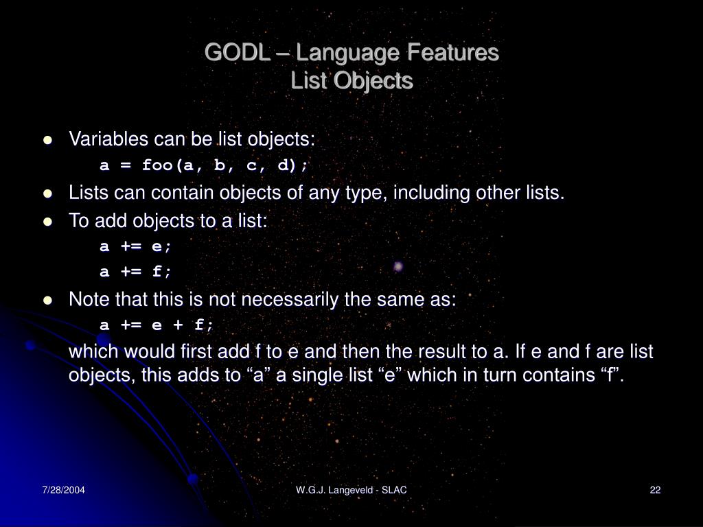 GODL – Language FeaturesList Objects • Variables can be list objects: a = foo(a, b, c, d); • Lists can contain objects of any type, including other lists. • To add objects to a list: a += e; a += f; • Note that this is not necessarily the same as: a += e + f; which would first add f to e and then the result to a. If e and f are list objects, this adds to “a” a single list “e” which in turn contains “f”. W.G.J. Langeveld - SLAC