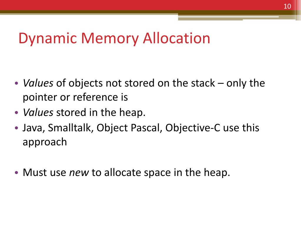 Dynamic Memory Allocation • Values of objects not stored on the stack – only the pointer or reference is • Values stored in the heap. • Java, Smalltalk, Object Pascal, Objective-C use this approach • Must use new to allocate space in the heap.