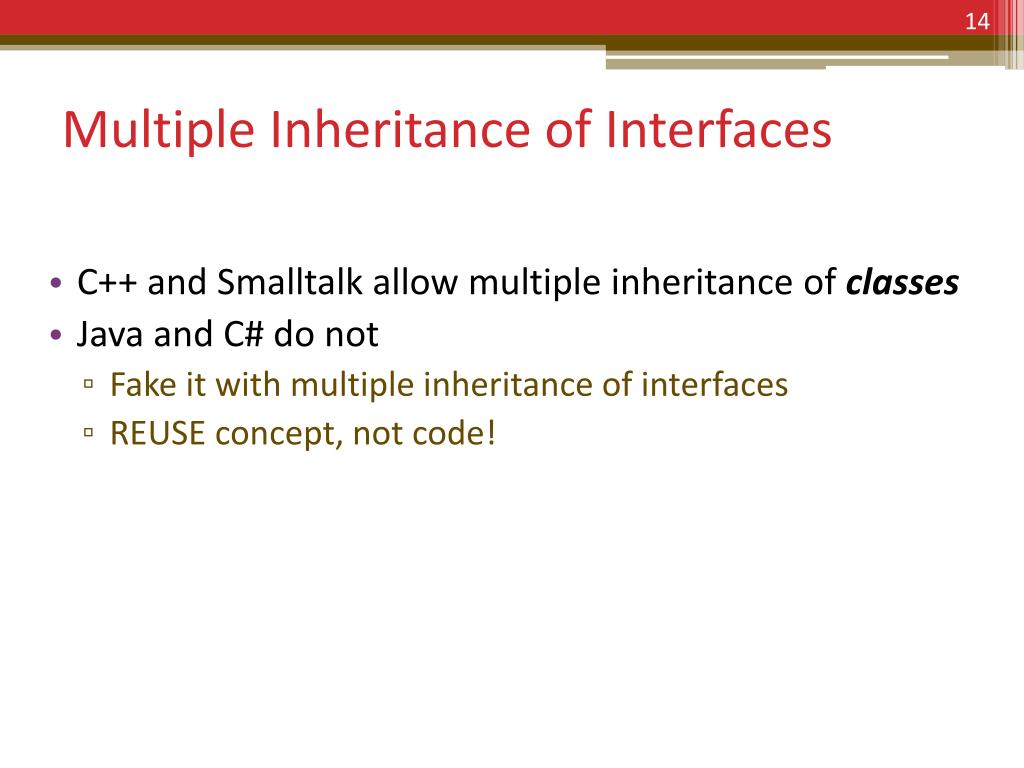 Multiple Inheritance of Interfaces • C++ and Smalltalk allow multiple inheritance of classes • Java and C# do not • Fake it with multiple inheritance of interfaces • REUSE concept, not code!