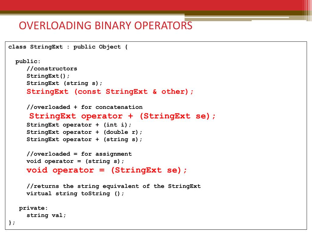 OVERLOADING BINARY OPERATORS class StringExt : public Object { public: //constructors StringExt(); StringExt(string s); StringExt(constStringExt & other); //overloaded + for concatenation StringExtoperator + (StringExt se); StringExtoperator + (int i); StringExtoperator + (double r); StringExtoperator + (string s); //overloaded = for assignment void operator = (string s); void operator = (StringExt se); //returns the string equivalent of the StringExt virtual string toString (); private: string val; };