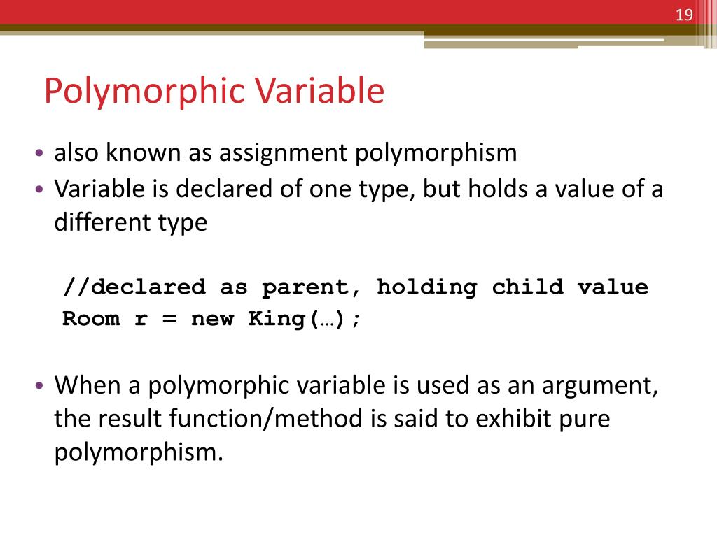 Polymorphic Variable • also known as assignment polymorphism • Variable is declared of one type, but holds a value of a different type //declared as parent, holding child value Room r = new King(…); • When a polymorphic variable is used as an argument, the result function/method is said to exhibit pure polymorphism.
