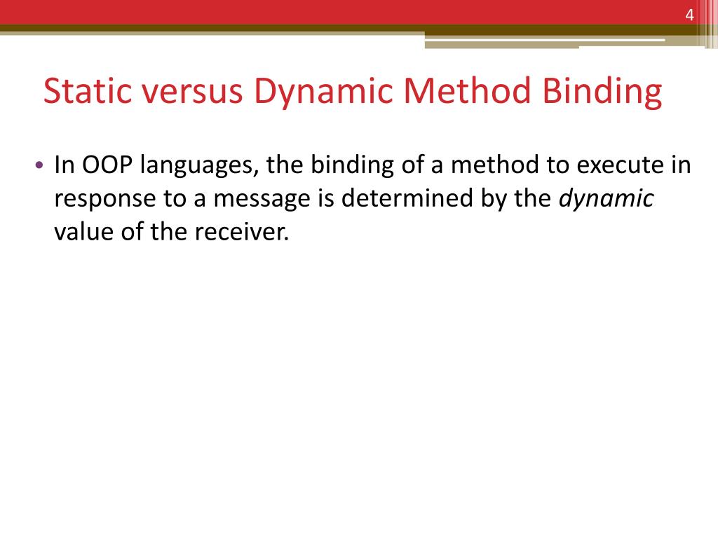 Static versus Dynamic Method Binding • In OOP languages, the binding of a method to execute in response to a message is determined by the dynamic value of the receiver.