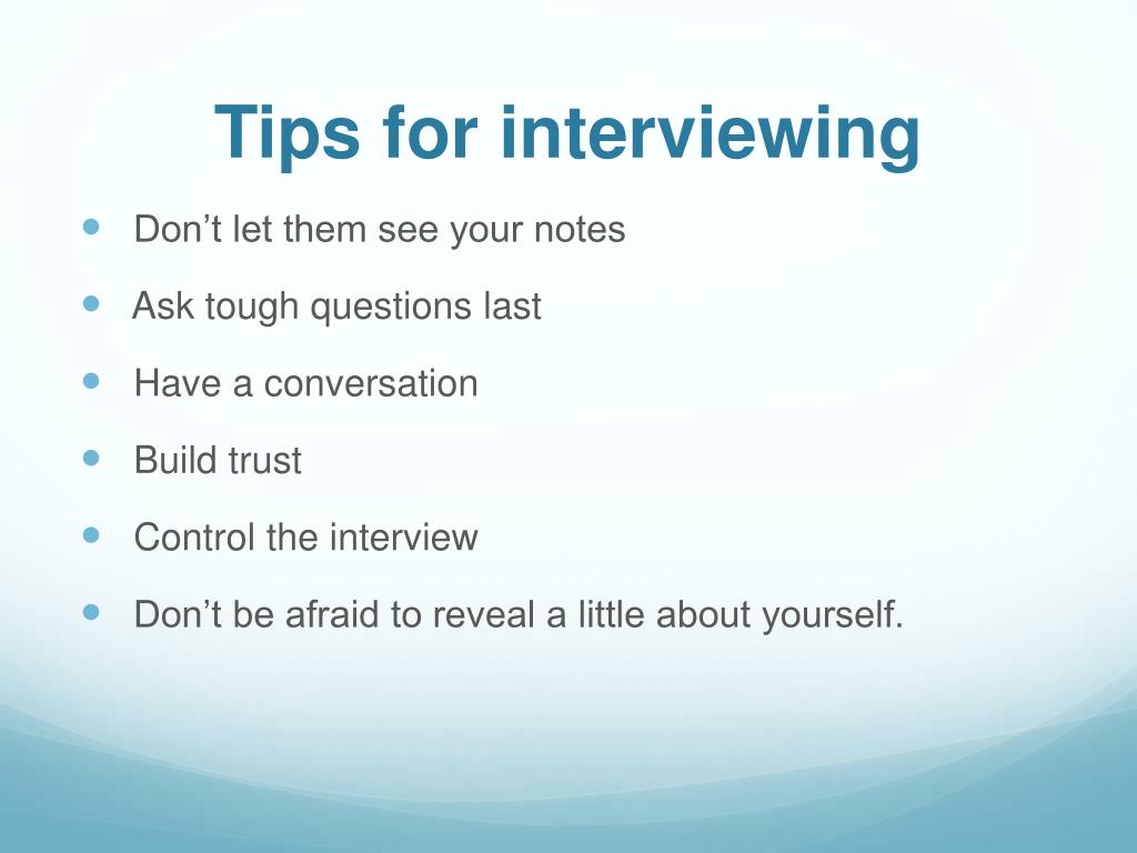 Tips for interviewing • Don’t let them see your notes • Ask tough questions last • Have a conversation • Build trust • Control the interview • Don’t be afraid to reveal a little about yourself.