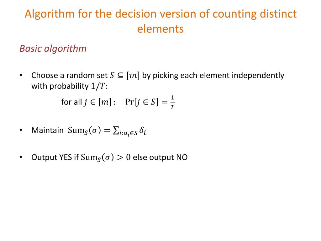 Algorithm for the decision version of counting distinct elements Basic algorithm • Choose a random set by picking each element independently with probability : for all • Maintain • Output YES if else output NO