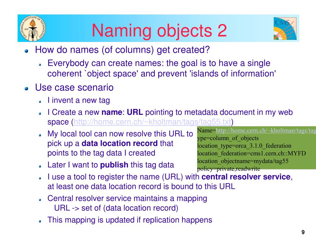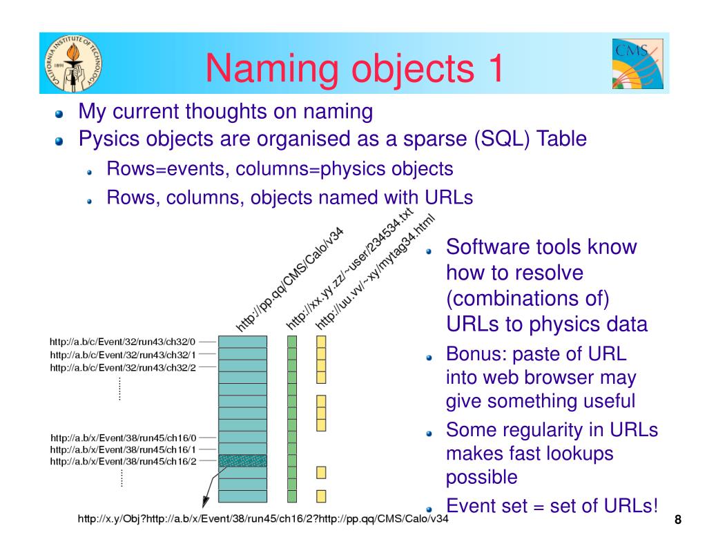 Naming objects 1 • My current thoughts on naming • Pysics objects are organised as a sparse (SQL) Table • Rows=events, columns=physics objects • Rows, columns, objects named with URLs • Software tools know how to resolve (combinations of) URLs to physics data • Bonus: paste of URL into web browser may give something useful • Some regularity in URLs makes fast lookups possible • Event set = set of URLs!