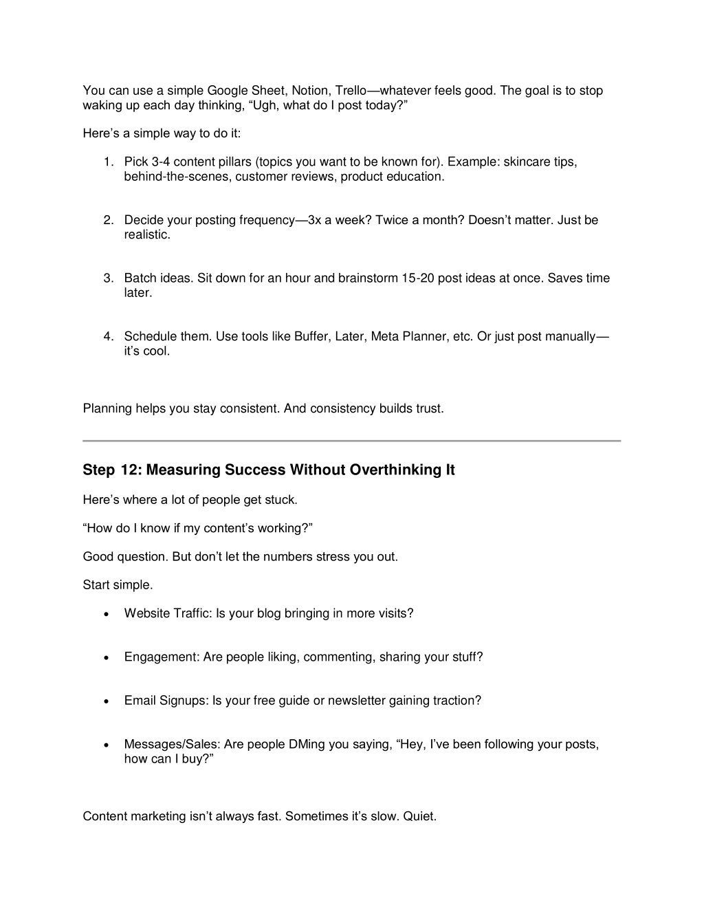 You can use a simple Google Sheet, Notion, Trello—whatever feels good. The goal is to stop waking up each day thinking, “Ugh, what do I posttoday?” Here’s a simple way to do it: 1. Pick 3-4 content pillars (topics you want to be known for). Example: skincare tips, behind-the-scenes, customer reviews, product education. 2. Decide your posting frequency—3x a week? Twice a month? Doesn’t matter. Just be realistic. 3. Batch ideas. Sit down for an hour and brainstorm 15-20 post ideas at once. Saves time later. 4. Schedule them. Use tools like Buffer, Later, Meta Planner, etc. Or just post manually— it’s cool. Planning helps you stay consistent. And consistency builds trust. Step12: Measuring Success Without Overthinking It Here’s where a lot of people get stuck. “How do I know if my content’s working?” Good question. But don’t let the numbers stress you out. Start simple. Website Traffic: Is your blog bringing in more visits? Engagement: Are people liking, commenting, sharing your stuff? Email Signups: Is your free guide or newsletter gaining traction? Messages/Sales: Are people DMing you saying, “Hey, I’ve been following your posts, how can I buy?” Content marketing isn’t always fast. Sometimes it’s slow. Quiet.