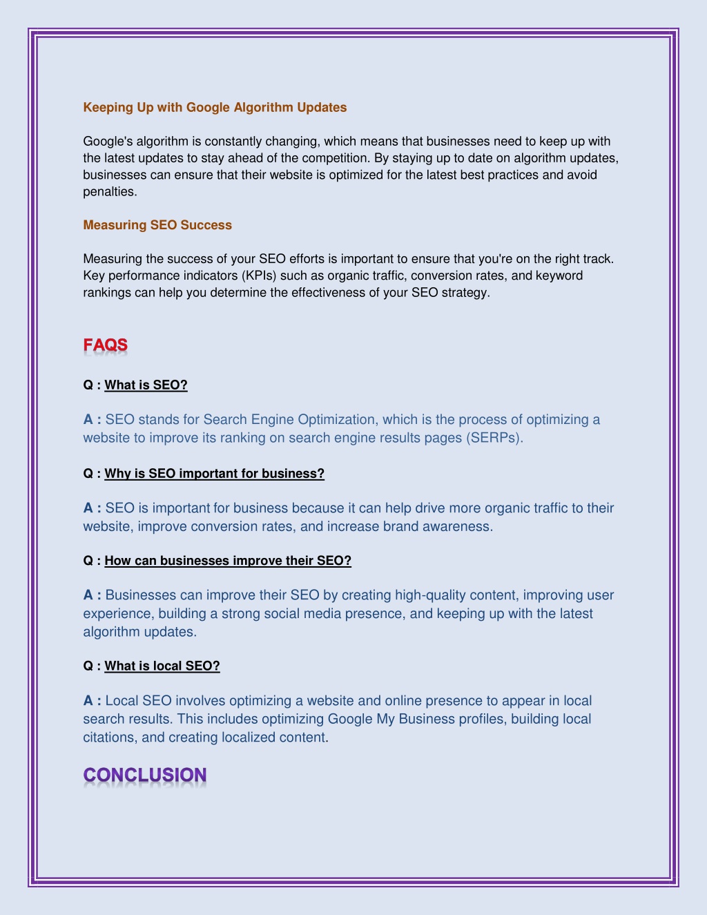 Keeping Up with Google Algorithm Updates Google's algorithm is constantly changing, which means that businesses need to keep up with the latest updates to stay ahead of the competition. By staying up to date on algorithm updates, businesses can ensure that their website is optimized for the latest best practices and avoid penalties. Measuring SEO Success Measuring the success of your SEO efforts is important to ensure that you're on the right track. Key performance indicators (KPIs) such as organic traffic, conversion rates, and keyword rankings can help you determine the effectiveness of your SEO strategy. Q :What is SEO? A : SEO stands for Search Engine Optimization, which is the process of optimizing a website to improve its ranking on search engine results pages (SERPs). Q : Why is SEO important for business? A : SEO is importantfor business because it can help drive more organic traffic to their website, improve conversion rates, and increase brand awareness. Q : How can businesses improve their SEO? A : Businesses can improve their SEO by creating high-quality content, improving user experience, building a strong social media presence, and keeping up with the latest algorithm updates. Q : What is local SEO? A : Local SEO involves optimizing a website and online presence to appear in local search results. This includes optimizing Google My Business profiles, building local citations, and creating localized content.