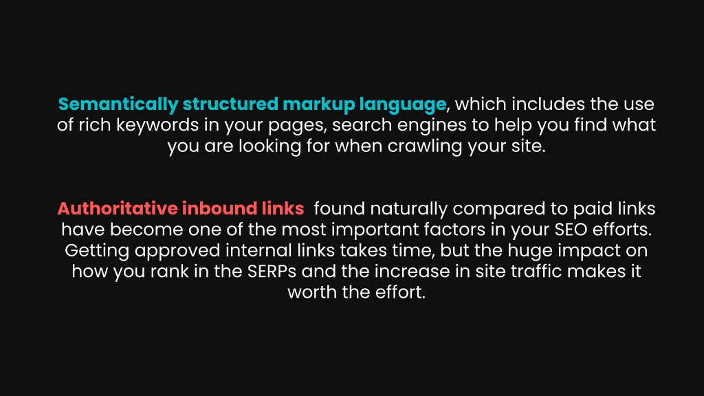 Semantically structured markup language, which includes the use of rich keywords in your pages, search engines to help you find what you are looking for when crawling your site. Authoritative inbound links found naturally compared to paid links have become one of the most important factors in your SEO efforts. Getting approved internal links takes time, but the huge impact on how you rank in the SERPs and the increase in site traffic makes it worth the effort.