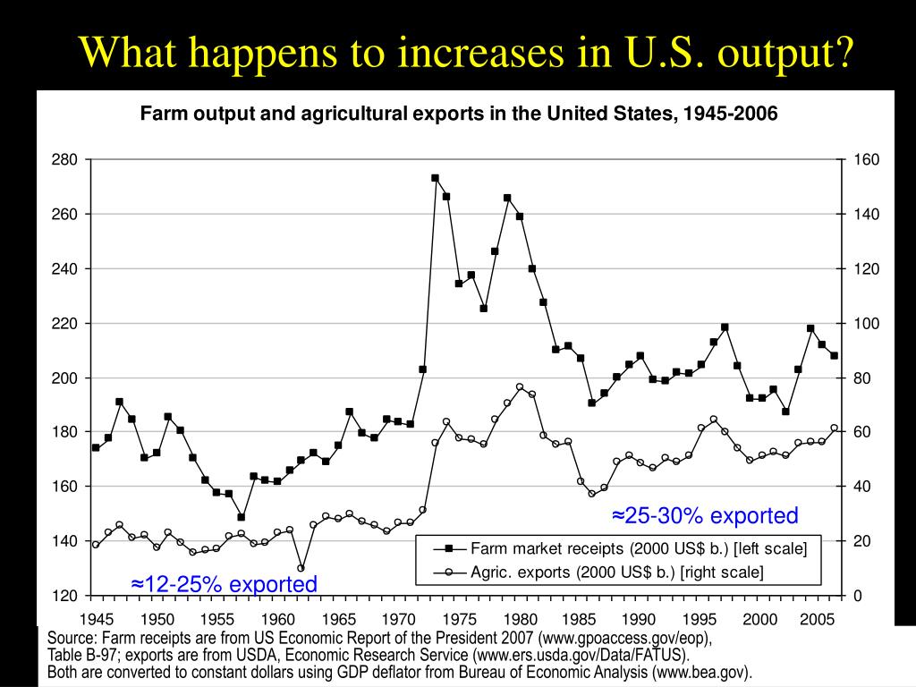 Source: Farm receipts are from US Economic Report of the President 2007 (www.gpoaccess.gov/eop), Table B-97; exports are from USDA, Economic Research Service (www.ers.usda.gov/Data/FATUS). Both are converted to constant dollars using GDP deflator from Bureau of Economic Analysis (www.bea.gov). What happens to increases in U.S. output? ≈25-30% exported ≈12-25% exported