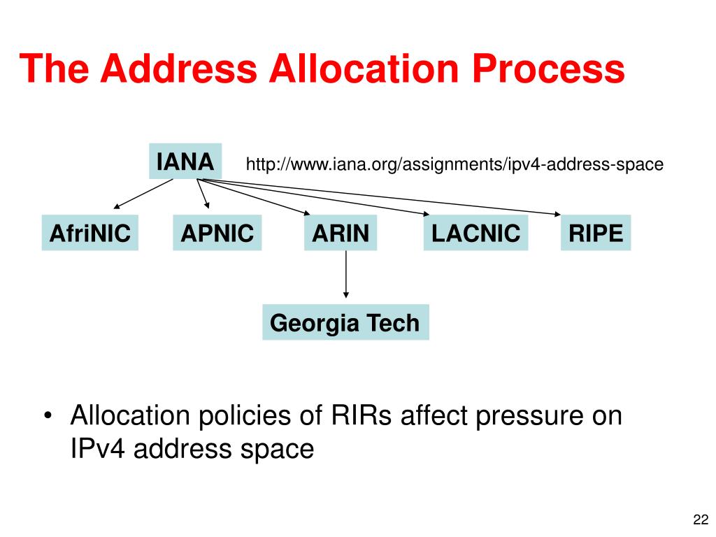 The Address Allocation Process • Allocation policies of RIRs affect pressure on IPv4 address space IANA http://www.iana.org/assignments/ipv4-address-space AfriNIC APNIC ARIN LACNIC RIPE Georgia Tech