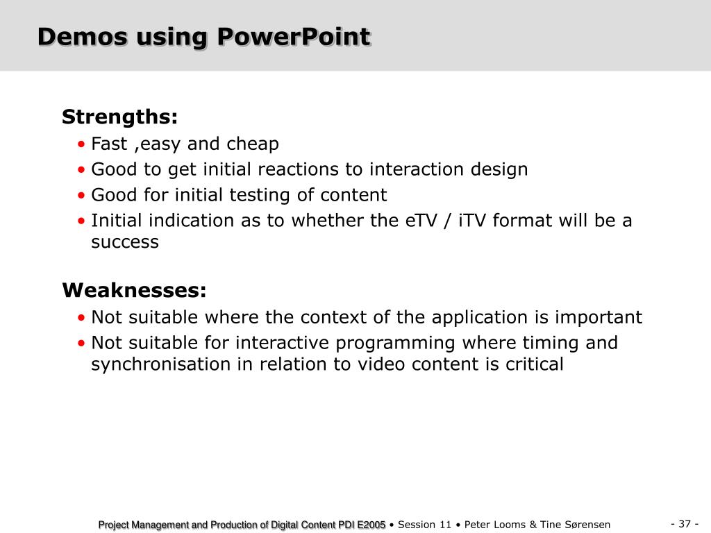 Demos using PowerPoint • Strengths: • Fast ,easy and cheap • Good to get initial reactions to interaction design • Good for initial testing of content • Initial indication as to whether the eTV / iTV format will be a success • Weaknesses: • Not suitable where the context of the application is important • Not suitable for interactive programming where timing and synchronisation in relation to video content is critical