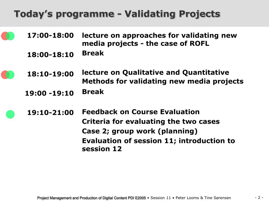 17:00-18:00 18:00-18:10 18:10-19:00 19:00 -19:10 19:10-21:00 lecture on approaches for validating new media projects - the case of ROFL Break lecture on Qualitative and Quantitative Methods for validating new media projects Break Feedback on Course Evaluation Criteria for evaluating the two cases Case 2; group work (planning) Evaluation of session 11; introduction to session 12 Today’s programme - Validating Projects