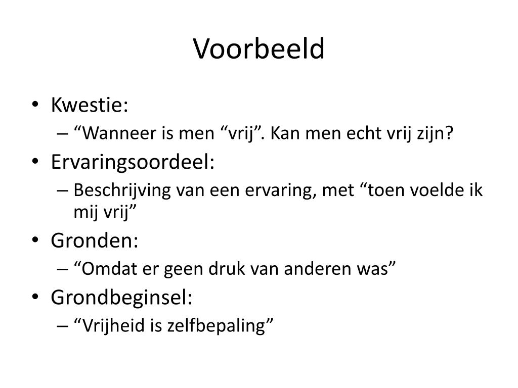 Voorbeeld • Kwestie: • “Wanneer is men “vrij”. Kan men echt vrij zijn? • Ervaringsoordeel: • Beschrijving van een ervaring, met “toen voelde ik mij vrij” • Gronden: • “Omdat er geen druk van anderen was” • Grondbeginsel: • “Vrijheid is zelfbepaling”