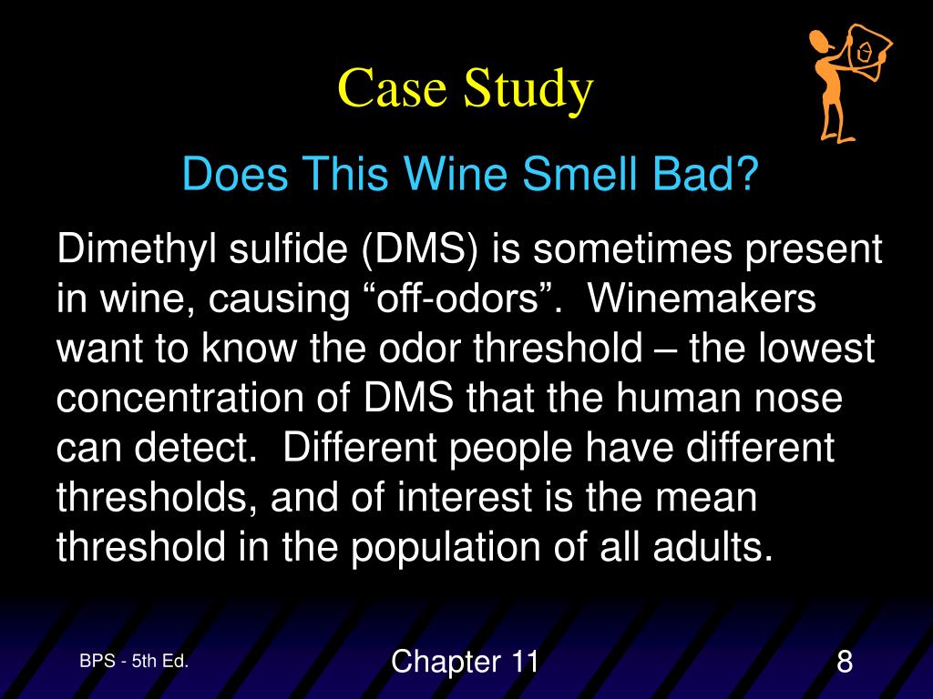 Case Study Does This Wine Smell Bad? Dimethyl sulfide (DMS) is sometimes present in wine, causing “off-odors”. Winemakers want to know the odor threshold – the lowest concentration of DMS that the human nose can detect. Different people have different thresholds, and of interest is the mean threshold in the population of all adults. Chapter 11