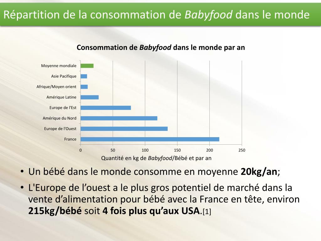 Répartition de la consommation de Babyfooddans le monde • Un bébé dans le monde consomme en moyenne 20kg/an; • L'Europe de l’ouest a le plus gros potentiel de marché dans la vente d’alimentation pour bébé avec la France en tête, environ 215kg/bébé soit 4 fois plus qu’aux USA.[1]