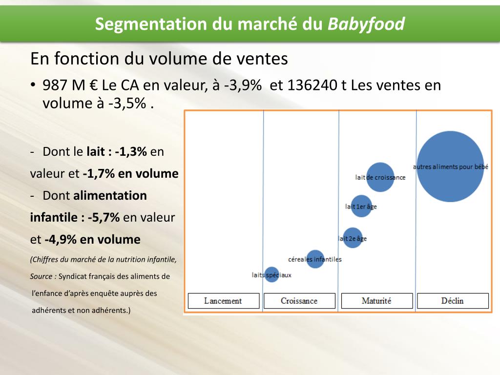Segmentation du marché du Babyfood En fonction du volume de ventes • 987 M € Le CA en valeur, à -3,9% et 136240 t Les ventes en volume à -3,5% . • Dont le lait : -1,3% en valeur et -1,7% en volume • Dont alimentation infantile : -5,7% en valeur et -4,9% en volume (Chiffres du marché de la nutrition infantile, Source : Syndicat français des aliments de l’enfance d’après enquête auprès des adhérents et non adhérents.)
