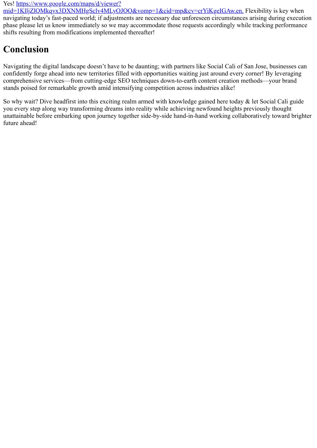 Yes! https://www.google.com/maps/d/viewer? mid=1KlljZlQMkqyx3DXNMHgSclv4MLyOJQQ&vomp=1&cid=mp&cv=crYiKgeIGAw.en. Flexibility is key when navigating today’s fast-paced world; if adjustments are necessary due unforeseen circumstances arising during execution phase please let us know immediately so we may accommodate those requests accordingly while tracking performance shifts resulting from modifications implemented thereafter! Conclusion Navigating the digital landscape doesn’t have to be daunting; with partners like Social Cali of San Jose, businesses can confidently forge ahead into new territories filled with opportunities waiting just around every corner! By leveraging comprehensive services—from cutting-edge SEO techniques down-to-earth content creation methods—your brand stands poised for remarkable growth amid intensifying competition across industries alike! So why wait? Dive headfirst into this exciting realm armed with knowledge gained here today & let Social Cali guide you every step along way transforming dreams into reality while achieving newfound heights previously thought unattainable before embarking upon journey together side-by-side hand-in-hand working collaboratively toward brighter future ahead!