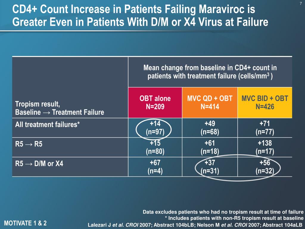 CD4+ Count Increase in Patients Failing Maraviroc is Greater Even in Patients With D/M or X4 Virus at Failure Data excludes patients who had no tropism result at time of failure* Includes patients with non-R5 tropism result at baseline MOTIVATE 1 & 2 Lalezari J et al. CROI 2007; Abstract 104bLB; Nelson M et al.CROI 2007; Abstract 104aLB