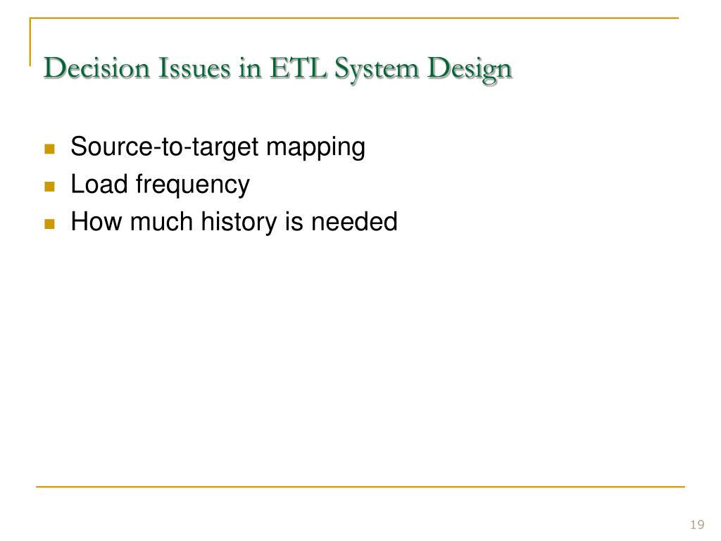 Decision Issues in ETL System Design Source-to-target mapping Load frequency How much history is needed 19