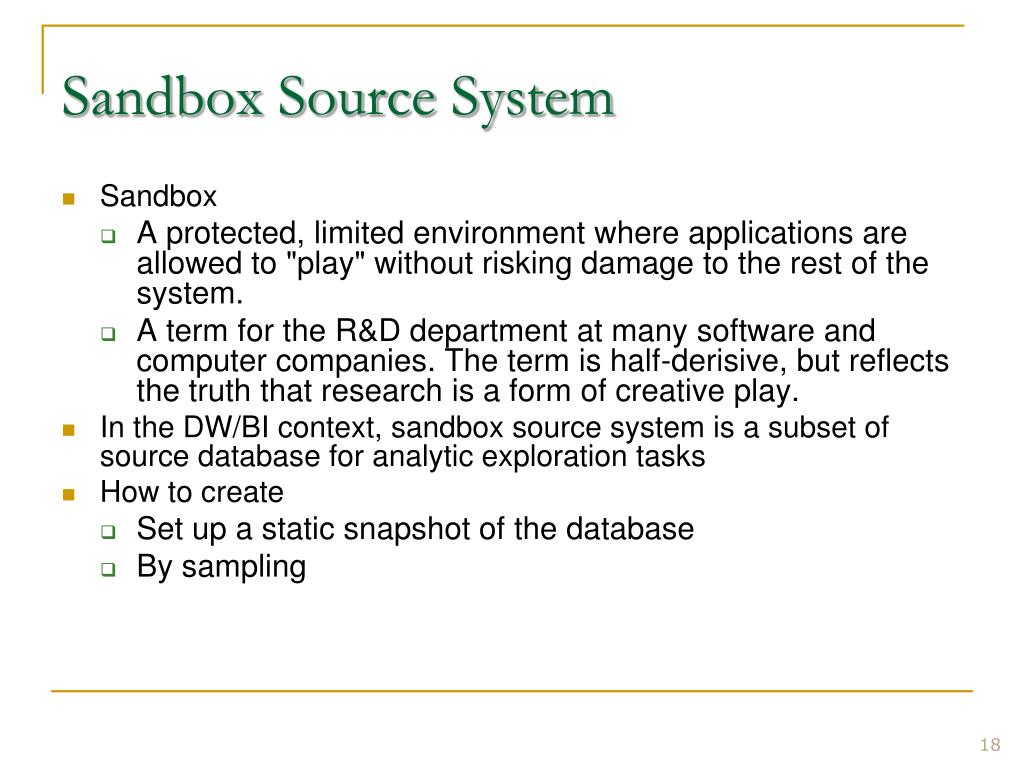 Sandbox Source System • Sandbox • A protected, limited environment where applications are allowed to "play" without risking damage to the rest of the system. • A term for the R&D department at many software and computer companies. The term is half-derisive, but reflects the truth that research is a form of creative play. • In the DW/BI context, sandbox source system is a subset of source database for analytic exploration tasks • How to create • Set up a static snapshot of the database • By sampling 18