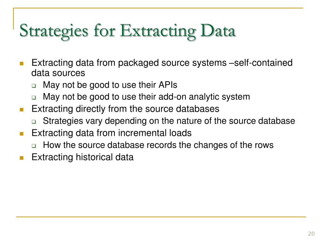 Strategies for Extracting Data • Extracting data from packaged source systems –self-contained data sources • May not be good to use their APIs • May not be good to use their add-on analytic system • Extracting directly from the source databases • Strategies vary depending on the nature of the source database • Extracting data from incremental loads • How the source database records the changes of the rows • Extracting historical data 20
