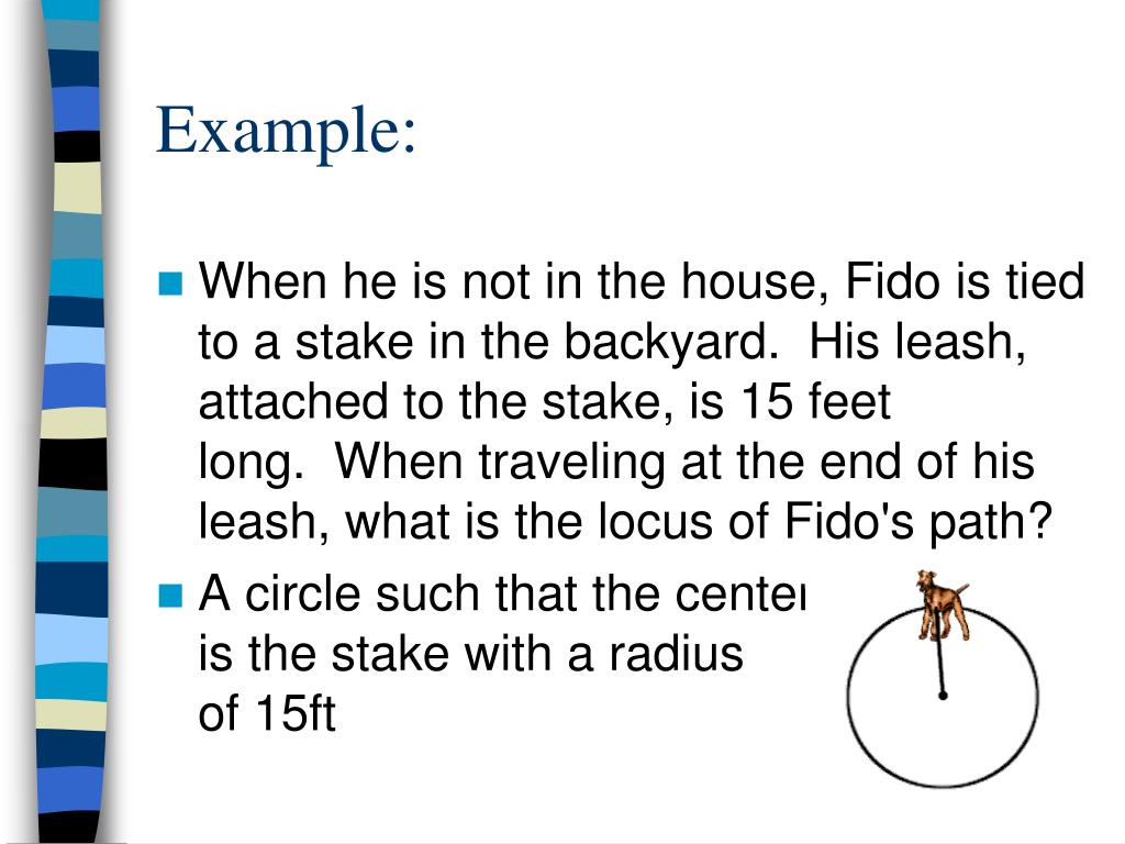 Example: • When he is not in the house, Fido is tied to a stake in the backyard. His leash, attached to the stake, is 15 feet long. When traveling at the end of his leash, what is the locus of Fido's path? • A circle such that the center is the stake with a radius of 15ft