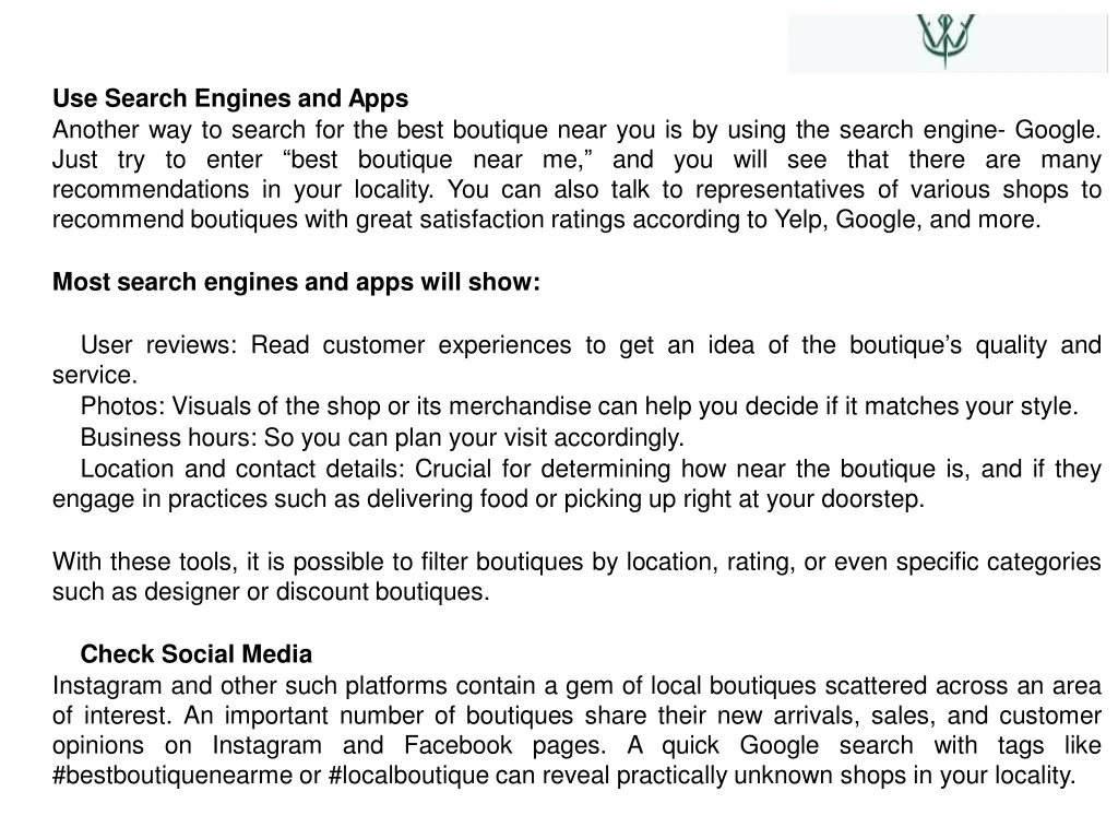 Use Search Engines and Apps Another way to search for the best boutique near you is by using the search engine- Google. Just try to enter “best boutique near me,” and you will see that there are many recommendations in your locality. You can also talk to representatives of various shops to recommend boutiques with great satisfaction ratings according to Yelp, Google, and more. Most search engines and apps will show: User reviews: Read customer experiences to get an idea of the boutique’s quality and service. Photos: Visuals of the shop or its merchandise can help you decide if it matches your style. Business hours: So you can plan your visit accordingly. Location and contact details: Crucial for determining how near the boutique is, and if they engage in practices such as delivering food or picking up right at your doorstep. With these tools, it is possible to filter boutiques by location, rating, or even specific categories such as designer or discount boutiques. Check Social Media Instagram and other such platforms contain a gem of local boutiques scattered across an area of interest. An important number of boutiques share their new arrivals, sales, and customer opinions on Instagram and Facebook pages. A quick Google search with tags like #bestboutiquenearme or #localboutique can reveal practically unknown shops in your locality.