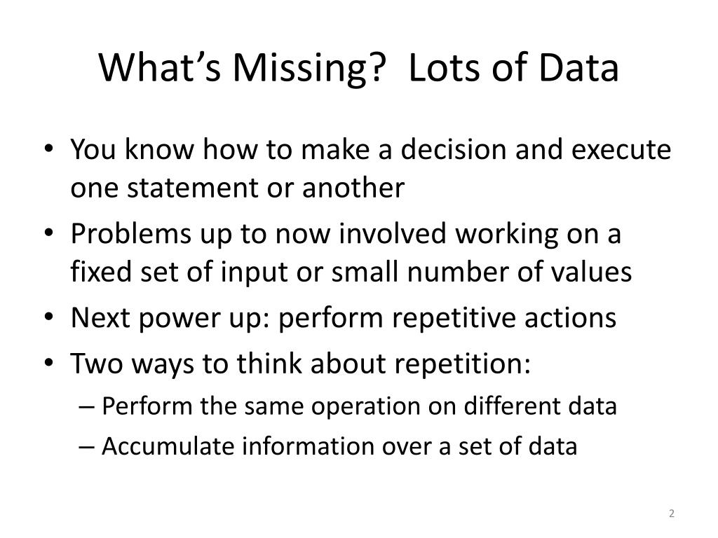 What’s Missing? Lots of Data • You know how to make a decision and execute one statement or another • Problems up to now involved working on a fixed set of input or small number of values • Next power up: perform repetitive actions • Two ways to think about repetition: • Perform the same operation on different data • Accumulate information over a set of data