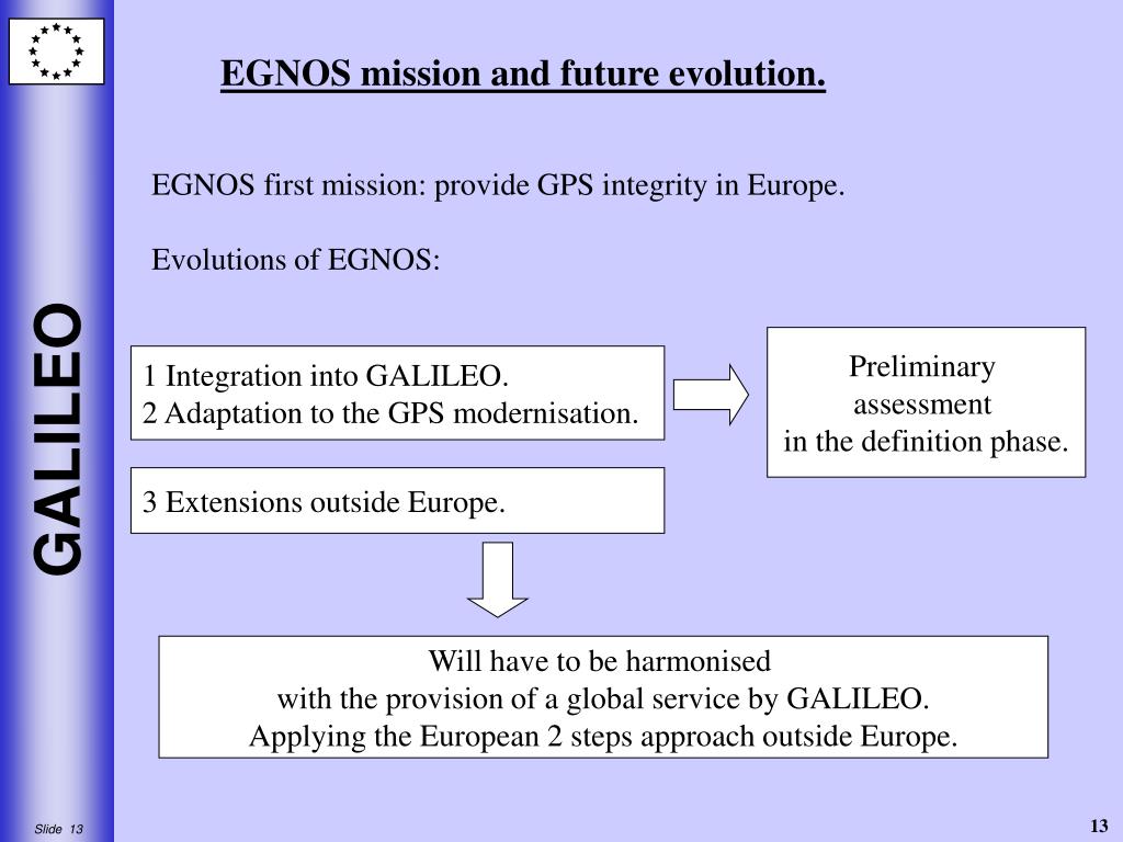 EGNOS mission and future evolution. EGNOS first mission: provide GPS integrity in Europe. Evolutions of EGNOS: Preliminary assessment in the definition phase. 1 Integration into GALILEO. 2 Adaptation to the GPS modernisation. 3 Extensions outside Europe. Will have to be harmonised with the provision of a global service by GALILEO. Applying the European 2 steps approach outside Europe.