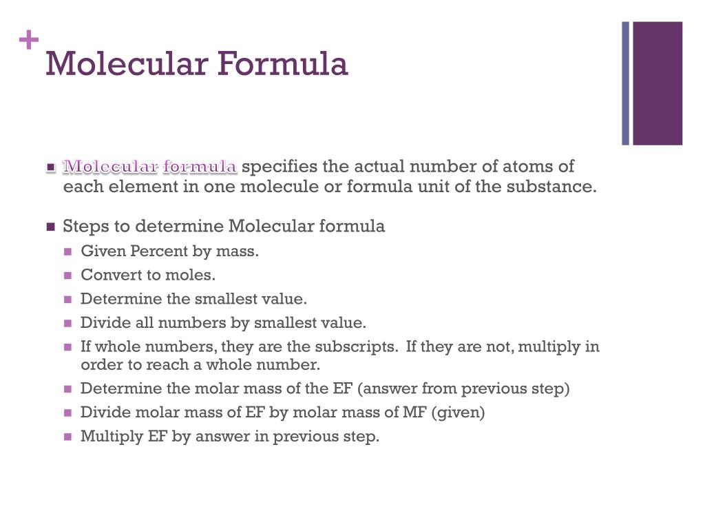 Molecular Formula • Molecular formula specifies the actual number of atoms of each element in one molecule or formula unit of the substance. • Steps to determine Molecular formula • Given Percent by mass. • Convert to moles. • Determine the smallest value. • Divide all numbers by smallest value. • If whole numbers, they are the subscripts. If they are not, multiply in order to reach a whole number. • Determine the molar mass of the EF (answer from previous step) • Divide molar mass of EF by molar mass of MF (given) • Multiply EF by answer in previous step.