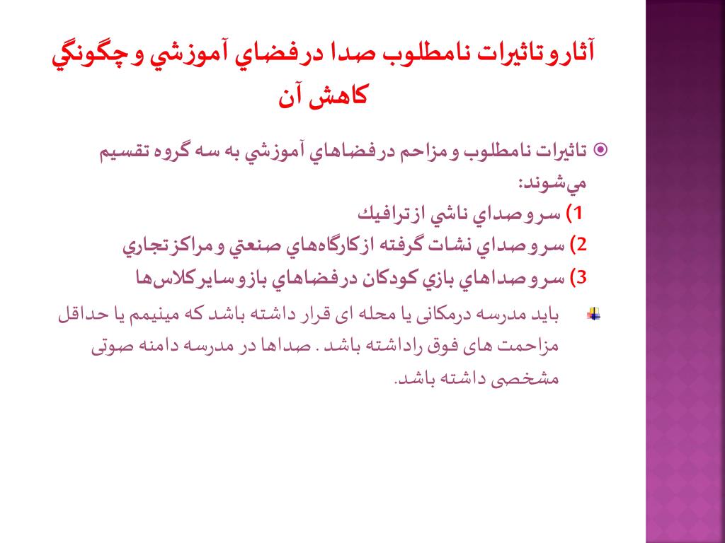 آثار و تاثیرات نامطلوب صدا در فضاي آموزشي و چگونگي كاهش آن • تاثیرات نامطلوب و مزاحم در فضاهاي آموزشي به سه گروه تقسيم ميشوند: 1) سر و صداي ناشي از ترافيك 2) سر و صداي نشات گرفته از كارگاههاي صنعتي و مراكز تجاري3) سر و صداهاي بازي کودکان در فضاهاي باز و ساير كلاسها • باید مدرسه درمکانی یا محله ای قرار داشته باشد که مینیمم یا حداقل مزاحمت های فوق راداشته باشد . صداها در مدرسه دامنه صوتی مشخصی داشته باشد.