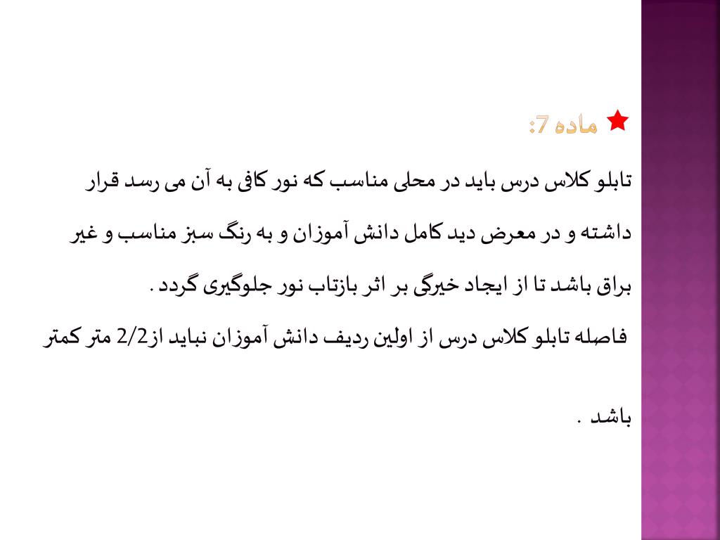 ماده 7:تابلو کلاس درس باید در محلی مناسب که نور کافی به آن می رسد قرار داشته و در معرض دید کامل دانش آموزان و به رنگ سبز مناسب و غیر براق باشد تا از ایجاد خیرگی بر اثر بازتاب نور جلوگیری گردد . فاصله تابلو کلاس درس از اولین ردیف دانش آموزان نباید از2/2 متر کمتر باشد .
