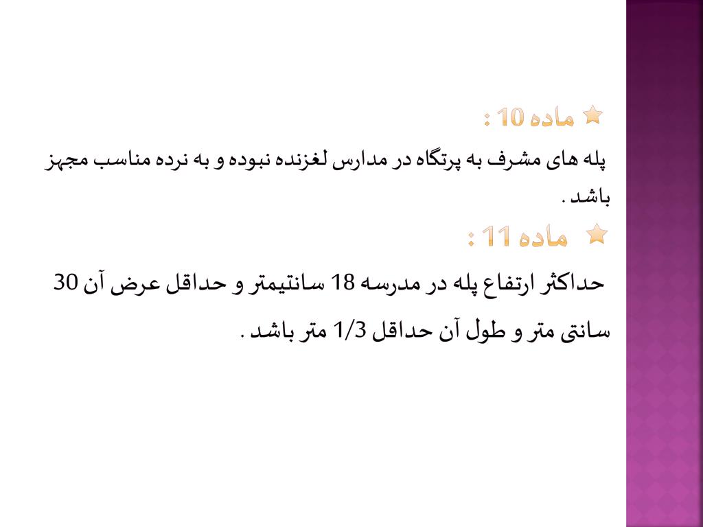 ماده 10 :پله های مشرف به پرتگاه در مدارس لغزنده نبوده و به نرده مناسب مجهز باشد . ماده 11 :حداکثر ارتفاع پله در مدرسه 18 سانتیمتر و حداقل عرض آن 30 سانتی متر و طول آن حداقل 1/3 متر باشد .