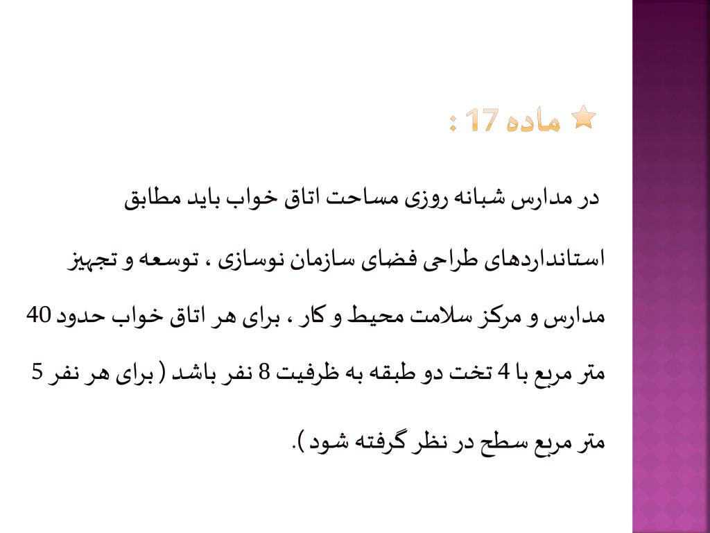 ماده 17 :در مدارس شبانه روزی مساحت اتاق خواب باید مطابق استانداردهای طراحی فضای سازمان نوسازی ، توسعه و تجهیز مدارس و مرکز سلامت محیط و کار ، برای هر اتاق خواب حدود 40 متر مربع با 4 تخت دو طبقه به ظرفیت 8 نفر باشد ( برای هر نفر 5 متر مربع سطح در نظر گرفته شود ).