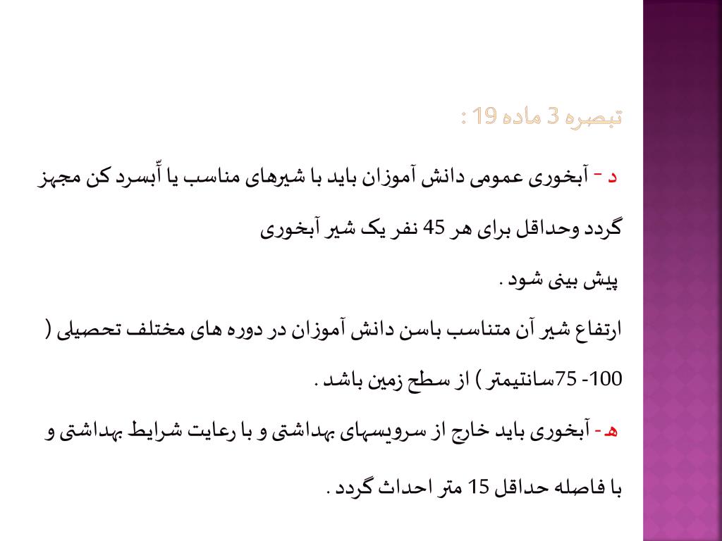 تبصره 3 ماده 19 :د – آبخوری عمومی دانش آموزان باید با شیرهای مناسب یا آّبسرد کن مجهز گردد وحداقل برای هر 45 نفر یک شیر آبخوری پیش بینی شود . ارتفاع شیر آن متناسب باسن دانش آموزان در دوره های مختلف تحصیلی ( 100- 75سانتیمتر ) از سطح زمین باشد . هـ - آبخوری باید خارج از سرویسهای بهداشتی و با رعایت شرایط بهداشتی و با فاصله حداقل 15 متر احداث گردد .