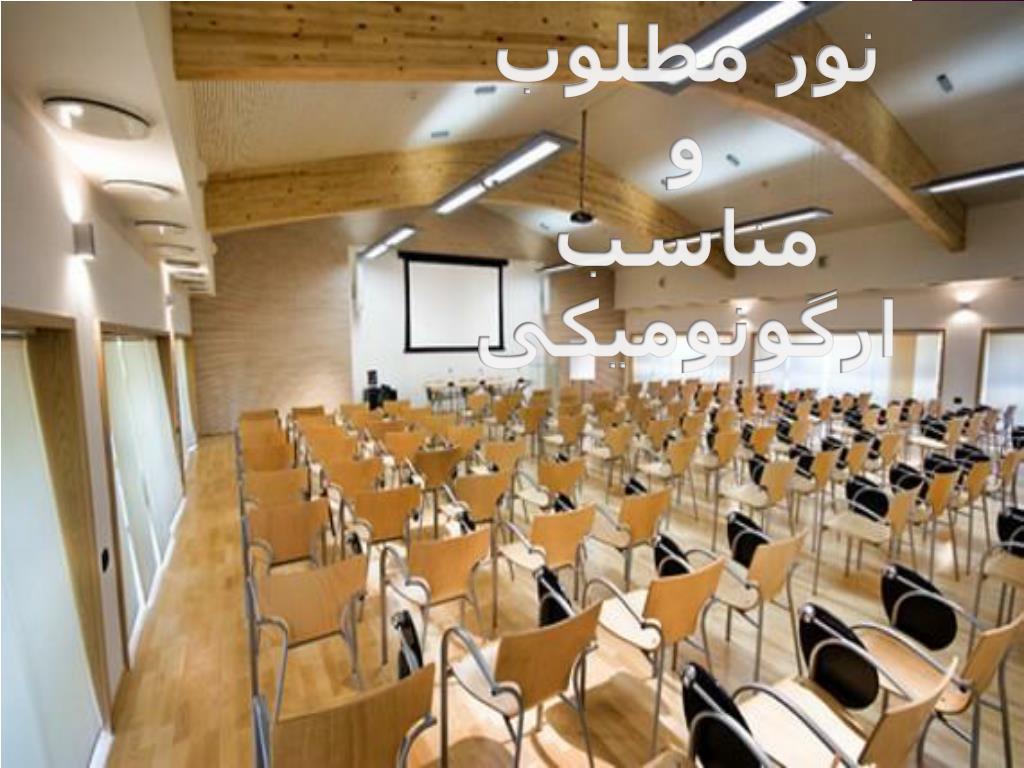 شرایط نور کافی • 1-دیدخوب و کافی دانش آموزان(شرایط بینایی) • 2- دانش آموزان پشت میز بتوانند از فاصله مشخصی تخته را ببیند . • 3- نور نباید موجب خیرگی چشم شود . • بهترین نور نور طبیعی می باشد . در حالتی که نتوانیم از نور طبیعی یا خورشید استفاده کنیم می توان نور مصنوعی را جانشین کرد.