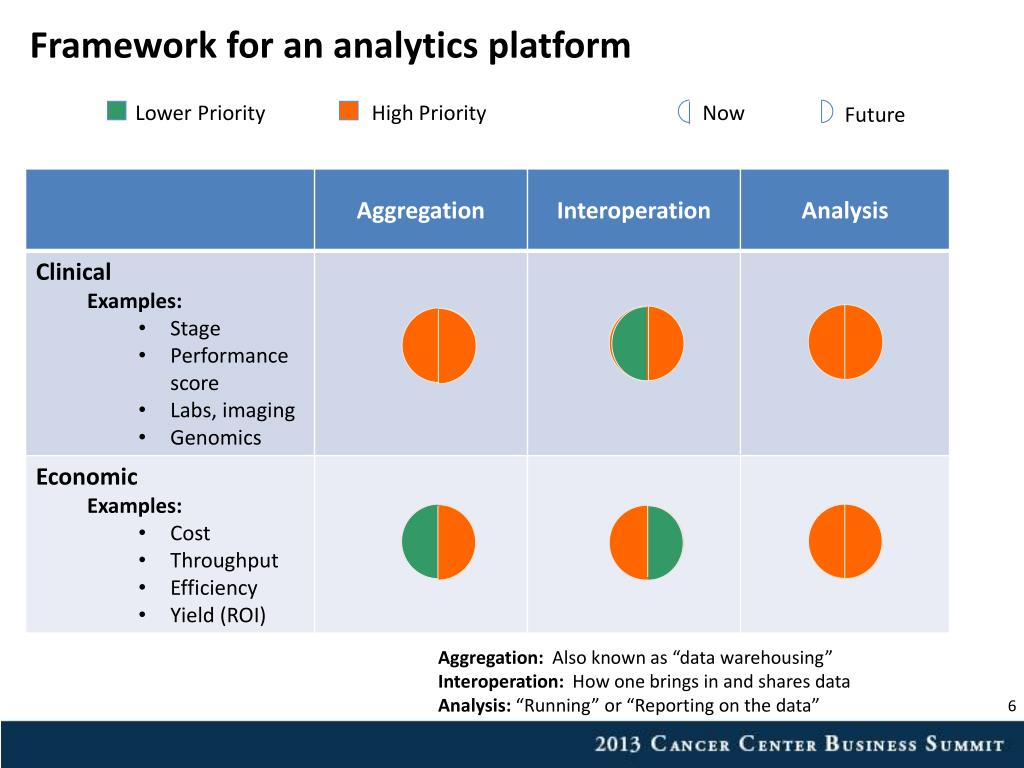 Framework for an analytics platform Lower Priority Now High Priority Future Aggregation: Also known as “data warehousing” Interoperation: How one brings in and shares data Analysis: “Running” or “Reporting on the data”