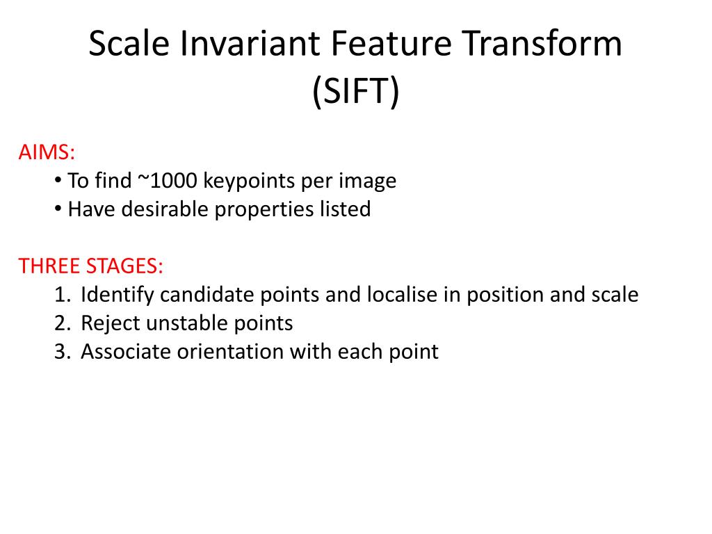 Scale Invariant Feature Transform(SIFT) • AIMS: • To find ~1000 keypoints per image • Have desirable properties listed • THREE STAGES: • Identify candidate points and localise in position and scale • Reject unstable points • Associate orientation with each point