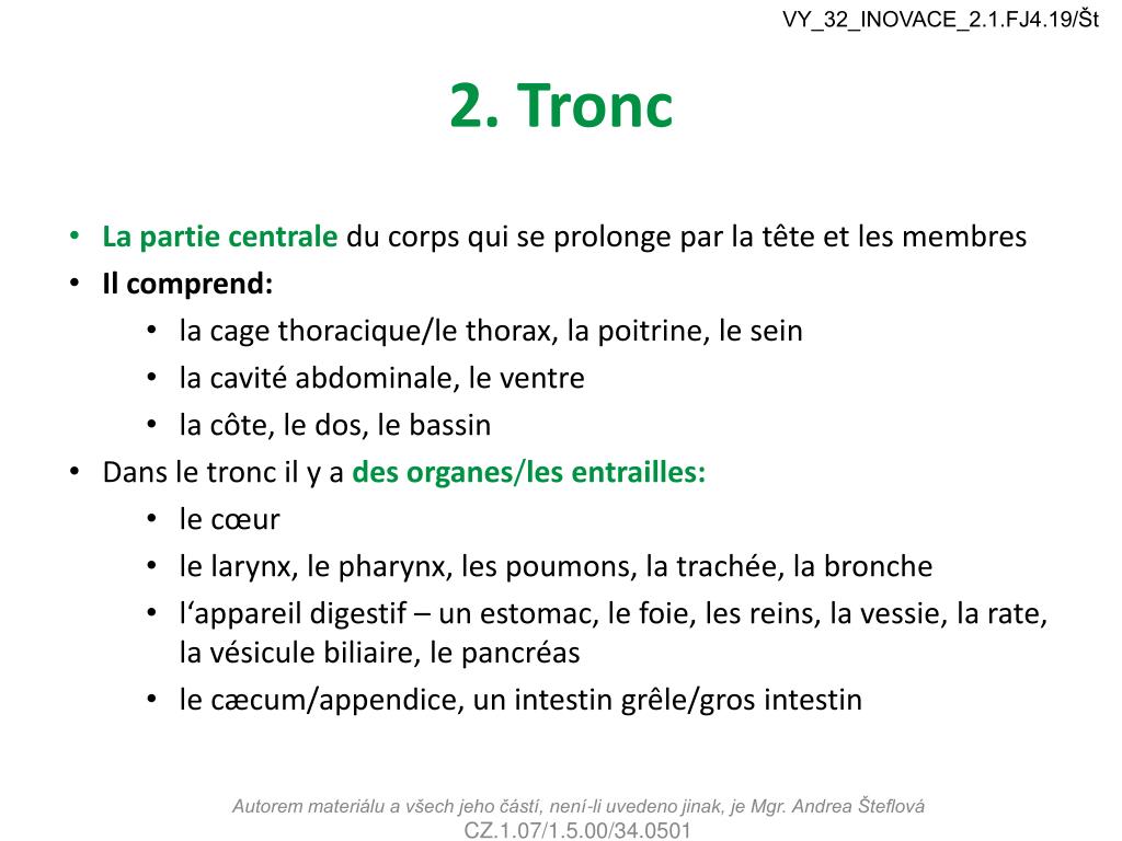 VY_32_INOVACE_2.1.FJ4.19/Št 2. Tronc • La partie centrale du corps qui se prolonge par la tête et les membres • Il comprend: • la cage thoracique/le thorax, la poitrine, le sein • la cavité abdominale, le ventre • la côte, le dos, lebassin • Dans le tronc il y a desorganes/les entrailles: • le cœur • le larynx, le pharynx, les poumons, la trachée, la bronche • l‘appareil digestif – un estomac, le foie, les reins, la vessie, la rate, la vésicule biliaire, le pancréas • le cæcum/appendice, un intestin grêle/gros intestin Autorem materiálu a všech jeho částí, není-li uvedeno jinak, je Mgr. Andrea Šteflová CZ.1.07/1.5.00/34.0501