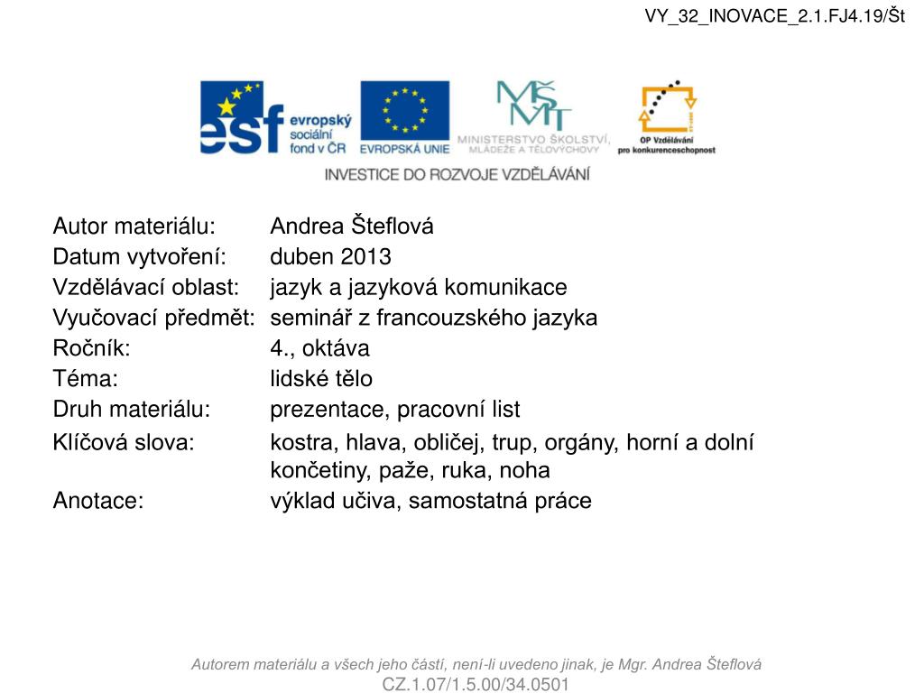 VY_32_INOVACE_2.1.FJ4.19/Št Corps humain Squelette, tête, visage, tronc, organes, membres supérieures/inférieures, bras, main, jambe, pied Autorem materiálu a všech jeho částí, není-li uvedeno jinak, je Mgr. Andrea Šteflová CZ.1.07/1.5.00/34.0501