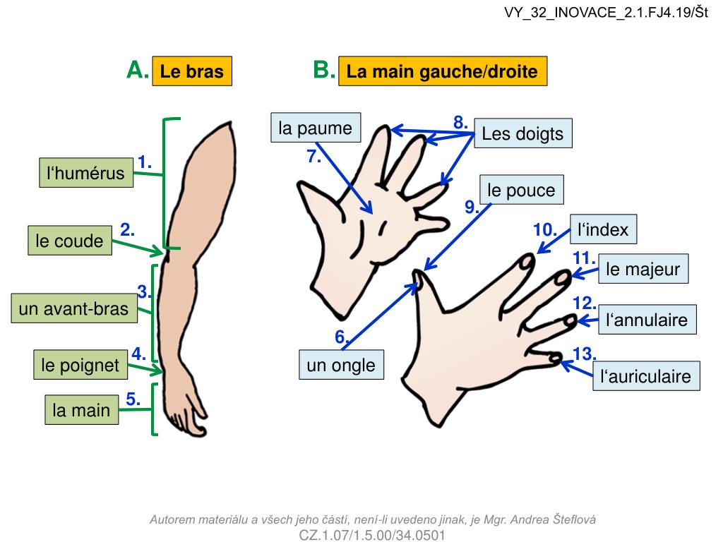 VY_32_INOVACE_2.1.FJ4.19/Št A. B. Le bras La main gauche/droite 8. la paume Les doigts 7. 1. l‘humérus le pouce 9. 2. 10. l‘index le coude 11. le majeur 3. 12. un avant-bras l‘annulaire 6. 4. 13. le poignet un ongle l‘auriculaire 5. la main Autorem materiálu a všech jeho částí, není-li uvedeno jinak, je Mgr. Andrea Šteflová CZ.1.07/1.5.00/34.0501