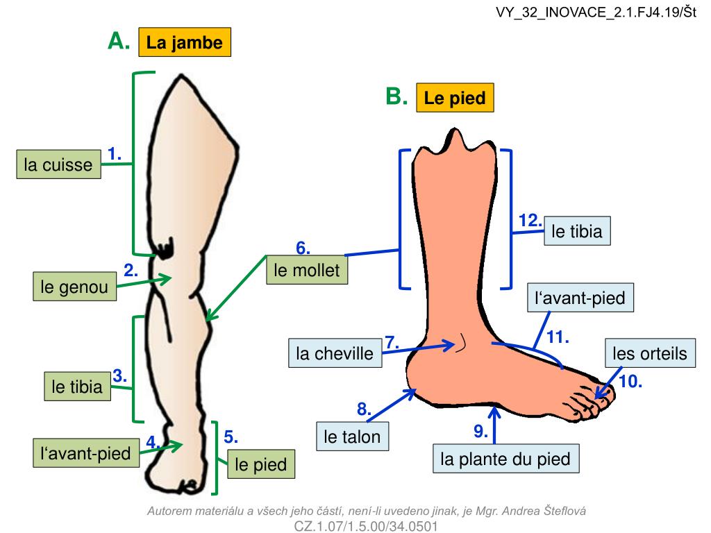 VY_32_INOVACE_2.1.FJ4.19/Št A. La jambe B. Le pied 1. la cuisse 12. le tibia 6. 2. le mollet le genou l‘avant-pied 11. 7. la cheville les orteils 3. 10. le tibia 8. 9. 5. le talon 4. l‘avant-pied la plante du pied le pied Autorem materiálu a všech jeho částí, není-li uvedeno jinak, je Mgr. Andrea Šteflová CZ.1.07/1.5.00/34.0501