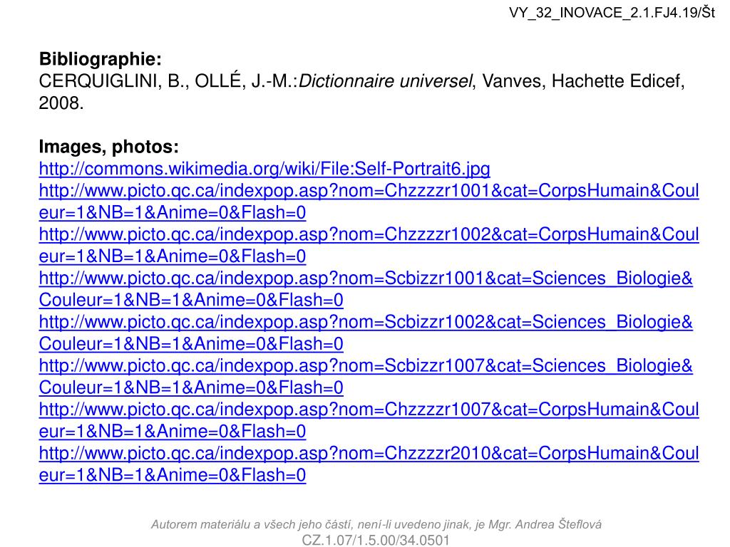 VY_32_INOVACE_2.1.FJ4.19/Št Bibliographie: CERQUIGLINI, B., OLLÉ, J.-M.:Dictionnaire universel, Vanves, Hachette Edicef, 2008. Images, photos: http://commons.wikimedia.org/wiki/File:Self-Portrait6.jpg http://www.picto.qc.ca/indexpop.asp?nom=Chzzzzr1001&cat=CorpsHumain&Couleur=1&NB=1&Anime=0&Flash=0 http://www.picto.qc.ca/indexpop.asp?nom=Chzzzzr1002&cat=CorpsHumain&Couleur=1&NB=1&Anime=0&Flash=0 http://www.picto.qc.ca/indexpop.asp?nom=Scbizzr1001&cat=Sciences_Biologie&Couleur=1&NB=1&Anime=0&Flash=0 http://www.picto.qc.ca/indexpop.asp?nom=Scbizzr1002&cat=Sciences_Biologie&Couleur=1&NB=1&Anime=0&Flash=0 http://www.picto.qc.ca/indexpop.asp?nom=Scbizzr1007&cat=Sciences_Biologie&Couleur=1&NB=1&Anime=0&Flash=0 http://www.picto.qc.ca/indexpop.asp?nom=Chzzzzr1007&cat=CorpsHumain&Couleur=1&NB=1&Anime=0&Flash=0 http://www.picto.qc.ca/indexpop.asp?nom=Chzzzzr2010&cat=CorpsHumain&Couleur=1&NB=1&Anime=0&Flash=0 Autorem materiálu a všech jeho částí, není-li uvedeno jinak, je Mgr. Andrea Šteflová CZ.1.07/1.5.00/34.0501