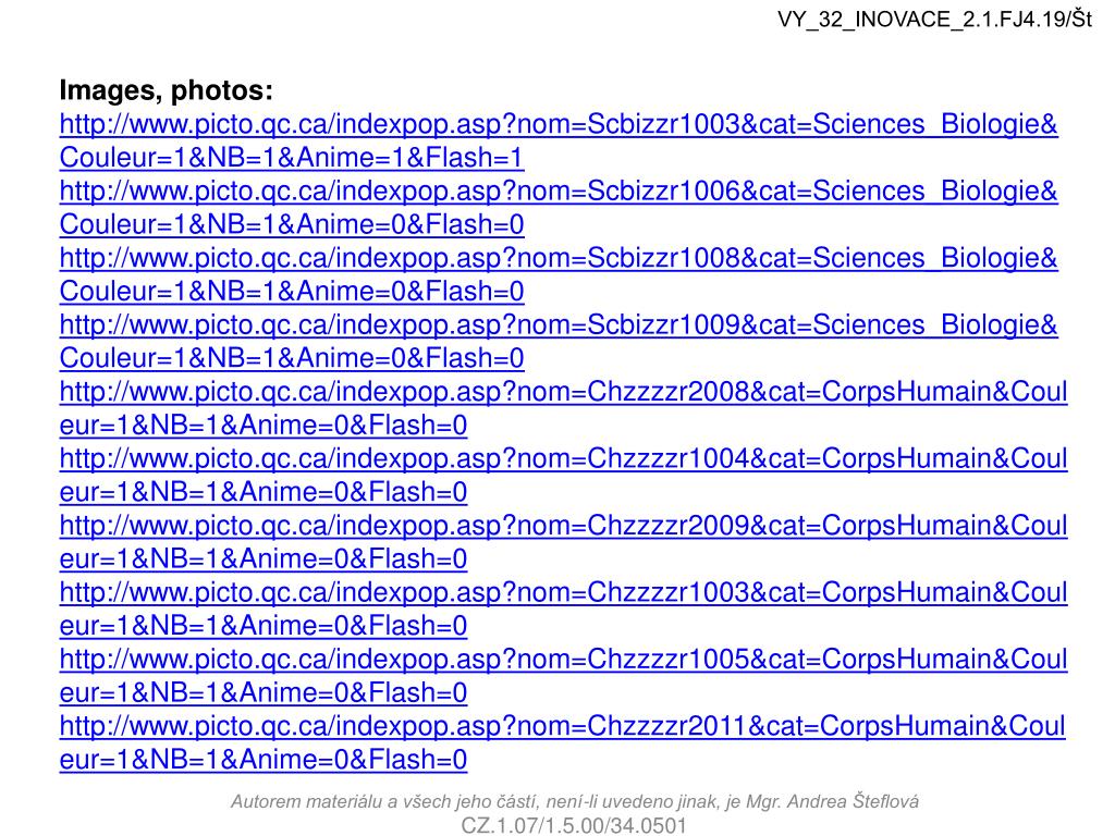 VY_32_INOVACE_2.1.FJ4.19/Št Images, photos: http://www.picto.qc.ca/indexpop.asp?nom=Scbizzr1003&cat=Sciences_Biologie&Couleur=1&NB=1&Anime=1&Flash=1 http://www.picto.qc.ca/indexpop.asp?nom=Scbizzr1006&cat=Sciences_Biologie&Couleur=1&NB=1&Anime=0&Flash=0 http://www.picto.qc.ca/indexpop.asp?nom=Scbizzr1008&cat=Sciences_Biologie&Couleur=1&NB=1&Anime=0&Flash=0 http://www.picto.qc.ca/indexpop.asp?nom=Scbizzr1009&cat=Sciences_Biologie&Couleur=1&NB=1&Anime=0&Flash=0 http://www.picto.qc.ca/indexpop.asp?nom=Chzzzzr2008&cat=CorpsHumain&Couleur=1&NB=1&Anime=0&Flash=0 http://www.picto.qc.ca/indexpop.asp?nom=Chzzzzr1004&cat=CorpsHumain&Couleur=1&NB=1&Anime=0&Flash=0 http://www.picto.qc.ca/indexpop.asp?nom=Chzzzzr2009&cat=CorpsHumain&Couleur=1&NB=1&Anime=0&Flash=0 http://www.picto.qc.ca/indexpop.asp?nom=Chzzzzr1003&cat=CorpsHumain&Couleur=1&NB=1&Anime=0&Flash=0 http://www.picto.qc.ca/indexpop.asp?nom=Chzzzzr1005&cat=CorpsHumain&Couleur=1&NB=1&Anime=0&Flash=0 http://www.picto.qc.ca/indexpop.asp?nom=Chzzzzr2011&cat=CorpsHumain&Couleur=1&NB=1&Anime=0&Flash=0 Autorem materiálu a všech jeho částí, není-li uvedeno jinak, je Mgr. Andrea Šteflová CZ.1.07/1.5.00/34.0501