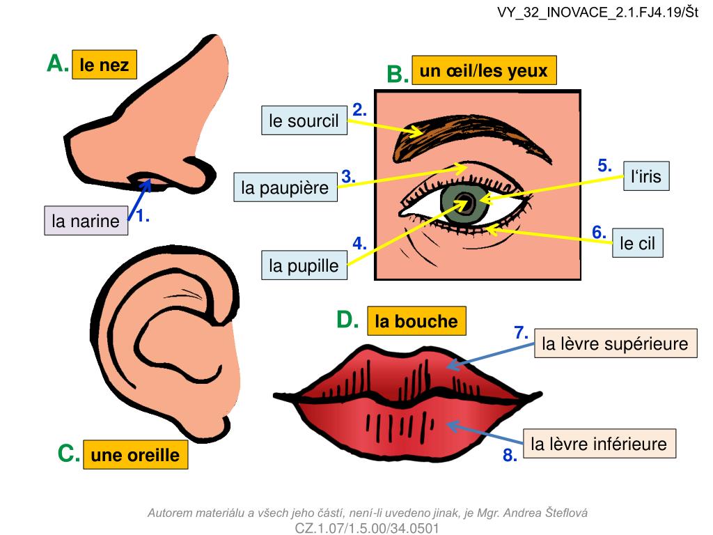 VY_32_INOVACE_2.1.FJ4.19/Št A. le nez B. un œil/les yeux 2. le sourcil 5. 3. l‘iris la paupière 1. la narine 6. 4. le cil la pupille D. la bouche 7. la lèvre supérieure la lèvre inférieure C. une oreille 8. Autorem materiálu a všech jeho částí, není-li uvedeno jinak, je Mgr. Andrea Šteflová CZ.1.07/1.5.00/34.0501